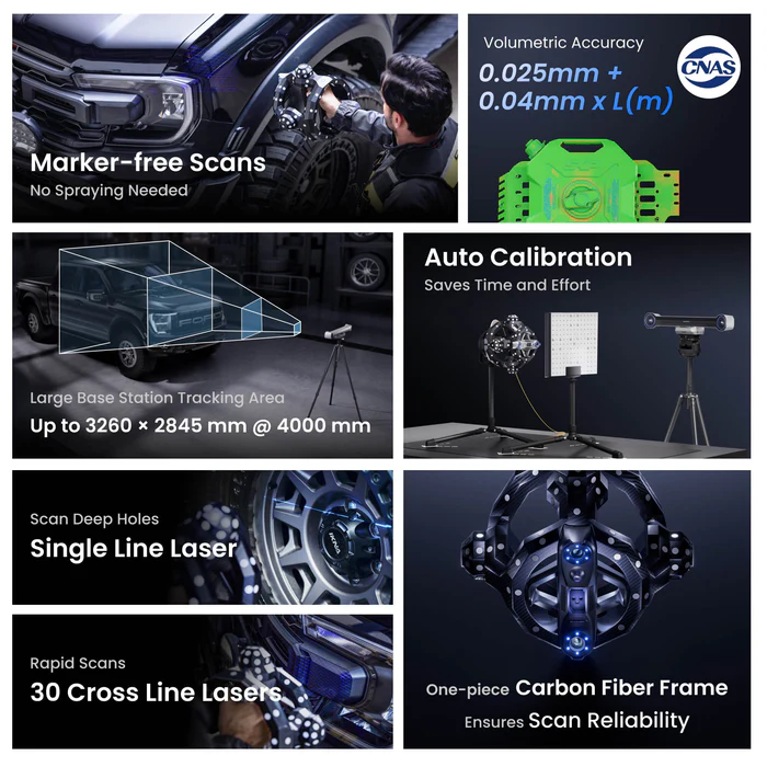 Sua tecnologia avançada permite a captura eficiente de geometrias complexas, superfícies técnicas e grandes conjuntos, mantendo a fidelidade dimensional necessária para fluxos de trabalho profissionais, como comparação CAD, inspeção metrológica e digitalização de peças industriais.